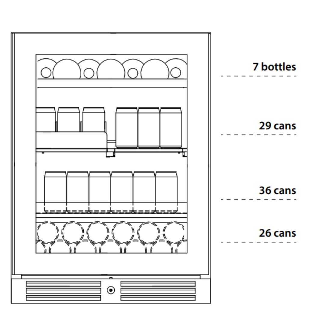 Capacity: 97 cans + 7 bottles (without drinks caddy) / 91 cans + 7 bottles (with drinks caddy)